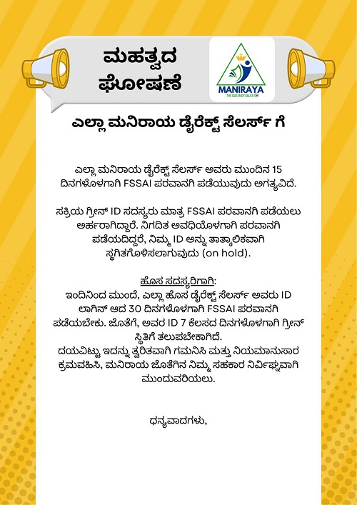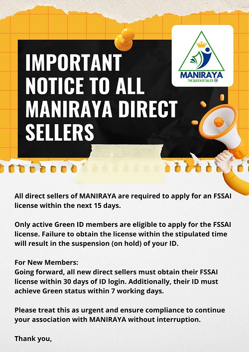 An individual /firm /company who is able to do contract as per the provision of the Indian contact act, 1872 and wish to become direct seller of the company, can apply to be appointed as a direct seller to marketing and selling of company’s product in whole of India , in prescribed form through online / manual. There is NO deposit or any charges / enrolment fees / joining fees / renewal charges for becoming a direct seller of the company. Our company shall not be responsible for any promises made by any individual/independent advisor/entity/direct seller/distributor on its behalf accept any promise which is mentioned in the authentic broachers or on website: www.maniraya.com.